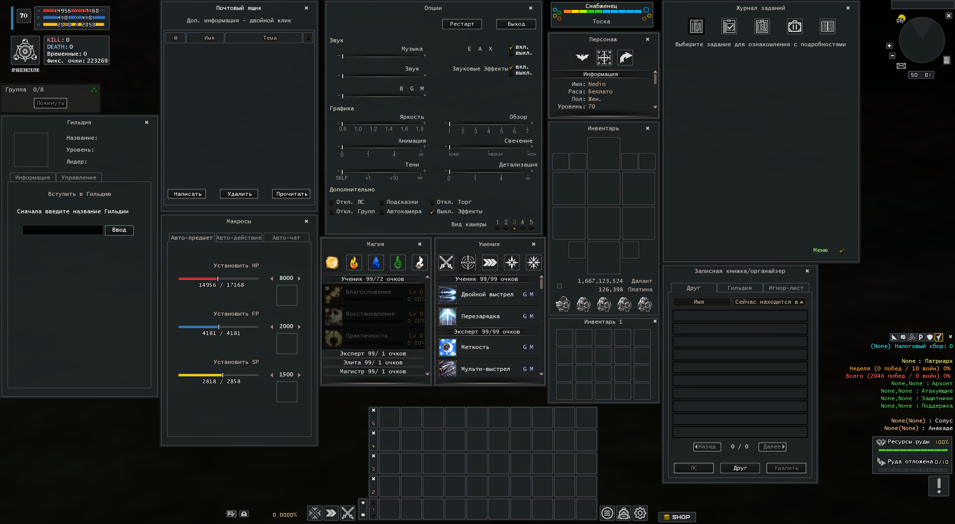 Interface "In memory" Интерфейс версии 1.9.0 под патч 24.0 Приятного пользования! Скачать интерфейс для сервера Х-100 Архив распаковать и скинуть в папку с игрой с полной заменой. Интерфейс делал чисто под PvPWaR x100 И так, что к чему: Общее представление об интерфейсе: https://pic.pvpwar.net/v/AmrHbtpN Изменено лоби выбора персонажа на ночное лоби (при выборе персонажа) ( работа U-ML ) https://pic.pvpwar.net/v/X4ZvTMmL Изменены цифры вылетающие при нанесении/получении урона, а так же block и miss Убрана видео-заставка Убраны все картинки появляющийся при смене локации. Уменьшено изображение игрока на карте. Уменьшено изображение врагов и друзей на карте на 15% Изменено изображение патриархов расы - гораздо легче их заметить. Изменено изображение ПБ - желтые "бублики", очень легко понять по цвету, что это именно пб, и из-за формы легко понять, кто его фармит. Изменены НПС на карте, уменьшены в 2 раза, что бы не мешали обзору. Заменены все карты на более светлые, что бы лучше видеть на них "друзей" и "врагов", А так же на карте зи добавлены все, известные мне, респы кубов в виде розовых кругов. И еще много-много изменений[/COLOR] |