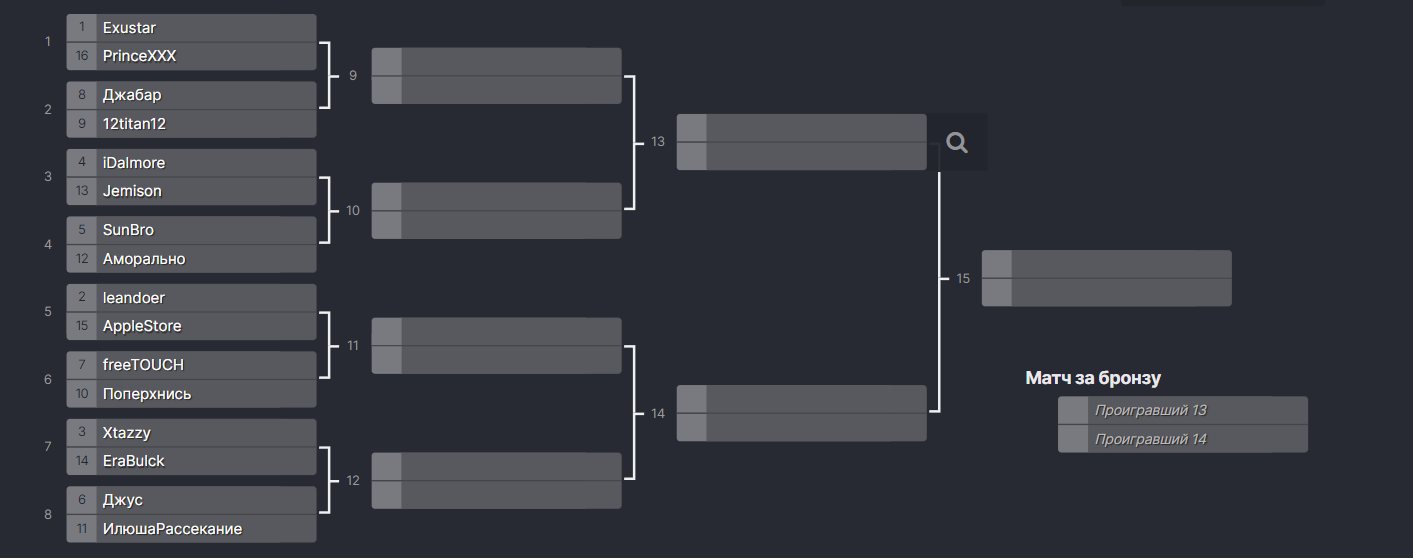 Доброго времени суток, Уважаемые игроки! Стартует первый раунд! Ниже представлены пары первого раунда. g1oom и ХХSPIKXX попадают в резерв, они будут кандидатами №1 на следующем турнире. Доступные скиллы: Напоминаю, что урон всех скиллов будет опубликован после завершения раунда! Доступные умения: Умения будут раскрыты после завершения раунда, все умения будут выбраны рандомайзером! У всех участников есть 24 часа, чтобы написать выбранные скиллы и умение. Раунд завершится раньше, если участники отпишутся быстрее. Напоминаю, что флуд в теме запрещен! Желаю удачи каждому! Победит везучий! |