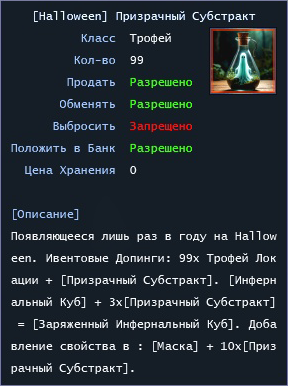 ○ Необходимо объединить у NPC Герой: 1х [Halloween] Призрачный Субстракт с любой маской для добавления случайного свойства.