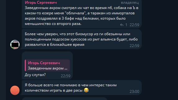 Хотя, как я уже написал выше, такие "расследования" заинтересуют разве что аудиторию, которая гыгыкает на сообщения в лс от персонажей, выдающих себя за других игроков - тех, кого я не пустил/выгнал из https://t.me/home_x100, где происходит ламповое общение любителей РФ онлайн без кидал, подсосов кидал, отморозков.